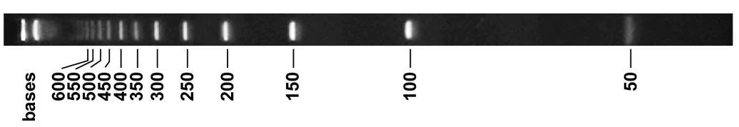 ss50 DNA Ladder is a single-stranded DNA marker preparation (100 microliters) containing DNA molecules of 50-nucleotide increments ranging from 50 to 500 nucleotides (optionally up to 600 nucleotides as shown above, upon request). The total DNA concentration is approximately 10 nanograms per microliter.